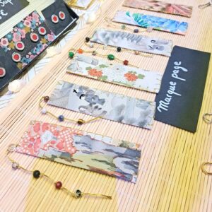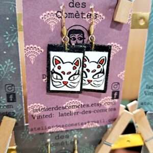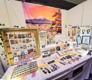 L’atelier des Comètes fait des créations en Upcycling avec des chutes de tissu japonais, du carton, des cadres anciens, qu’elle mixe avec ses illustrations à la plume. Vous trouverez sur son stand plein de bijoux dans l’univers japonais avec des Kanji, mais aussi des porte-clés et des marque-pages faits avec d’anciens vêtements japonais.