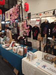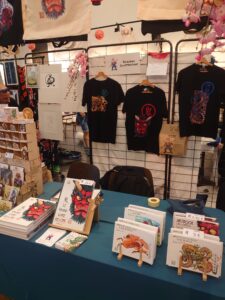 Joliane, la fille, expose ses dessins et goodies dans un style plus manga.